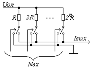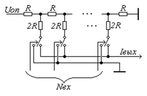 Этот ЦАП состоит из набора резисторов и набора ключей. Число ключей и число резисторов равно количеству разрядов n входного кода. Номиналы резисторов выбираются в соответствии с двоичным законом. Если R=3 Ом, то 2R= 6 Ом , 4R=12 Ом, и так и далее, т.е. каждый последующий резистор больше предыдущего в 2 раза. При присоединении источника напряжения и замыкании ключей, через каждый резистор потечет ток. Значения токов по резисторам, благодаря соответствующему выбору их номиналов, тоже будут распределены по двоичному закону. При подаче входного кода Nвх включение ключей производится в соответствии со значением соответствующих им разрядов входного кода. Ключ замыкается, если соответствующий ему разряд равен единице. При этом в узле суммируются токи, пропорциональные весам этих разрядов и величина вытекающего из узла тока в целом будет пропорциональна значению входного кода Nвх. Сопротивление резисторов матрицы выбирают достаточно большое (десятки кОм). Поэтому для большинства практических случаев для нагрузки ЦАП играет роль источника тока. Если на выходе преобразователя необходимо получить напряжение, то на выходе такого ЦАП устанавливается преобразователь "ток-напряжение", например, на операционном усилителе: